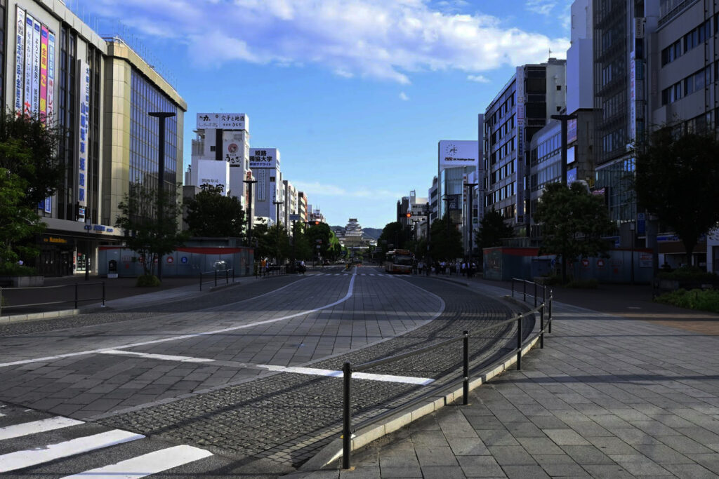 写真を見返して気づいたのだが、ガラス面に姫路城が反射して映っている!もう少し場所を調節して撮れば姫路城が大きく反射した写真が撮れていただろう。なんと粋な演出だ。さすがは世界の丹下だ。