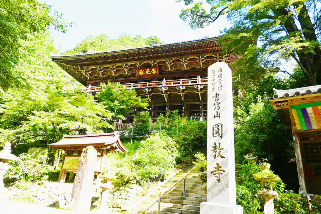 ロープウェイで山を登り、20分ほど歩くと迫力満点の摩尼殿がみえてくる。西の比叡山ともいわれる場所である。