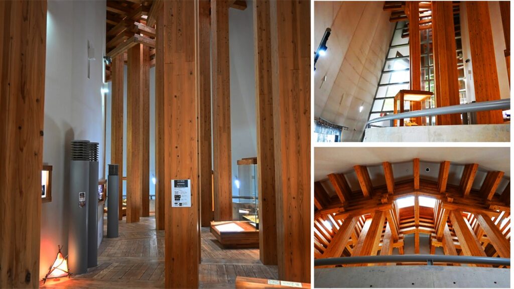 内部は高い吹き抜け天井を木組みで支え、その木組みから光が差し込む。柱が多いと感じたが、この柱が展示の仕切りとしての機能も果たしており、邪魔だとは感じなかった。